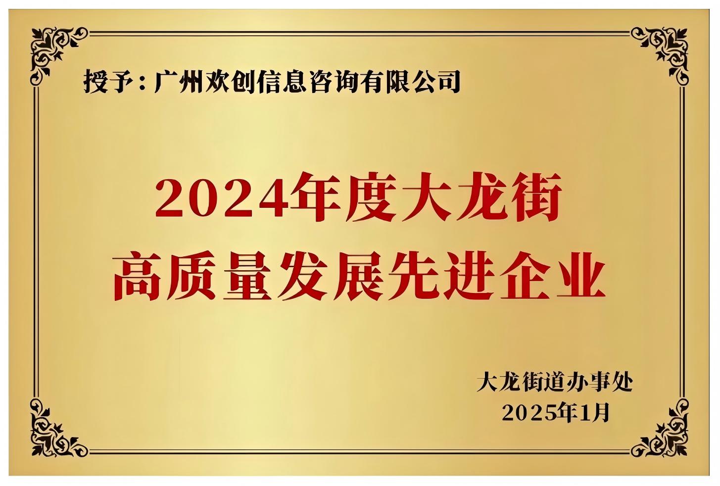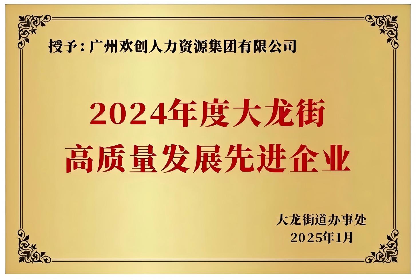 2025开门红,欢创集团屡创佳绩,不仅荣膺以上奖项,还荣获2024年度番禺区非公有制经济组织“双强六好”党组织称号、2024年度光彩事业贡献奖,与欢创信息荣获“2024年度人力资源优质服务商”及“5A人力资源服务机构诚信等级”;此外,总部大厦项目被评为中国房地产优秀代建项目,董事长罗宁弟荣获“2024广东商界十大新锐人物”和“最具风采奖”……这些荣誉充分证明了行业与社会对欢创集团深厚实力和卓越服务的高度认可。展望未来,欢创集团将持续以创新为动力,深化行业实践,积极推进技术创新与服务升级,为推动大龙街高质量发展贡献力量。